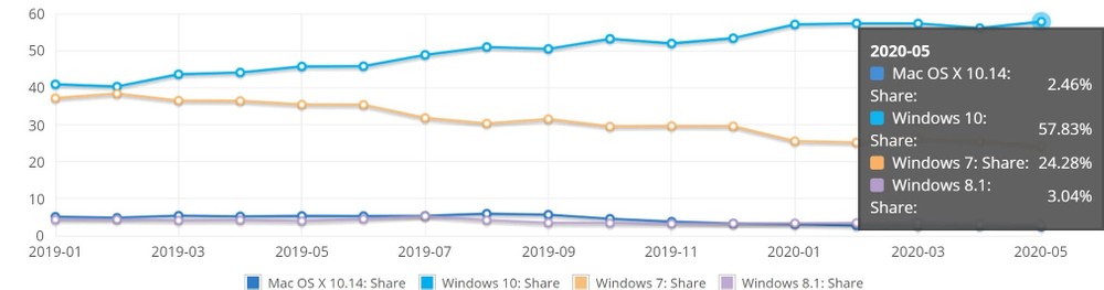 Aposentado no começo de 2020 pela Microsoft, o Windows 7 vem gradativamente diminuindo sua presença no mercado, ao passo que novas licenças com o Windows 10 são ativadas em PCs novos e upgrades feitos por seus usuários, o que incluiu a recém tomada da dianteira do sistema mais novo.