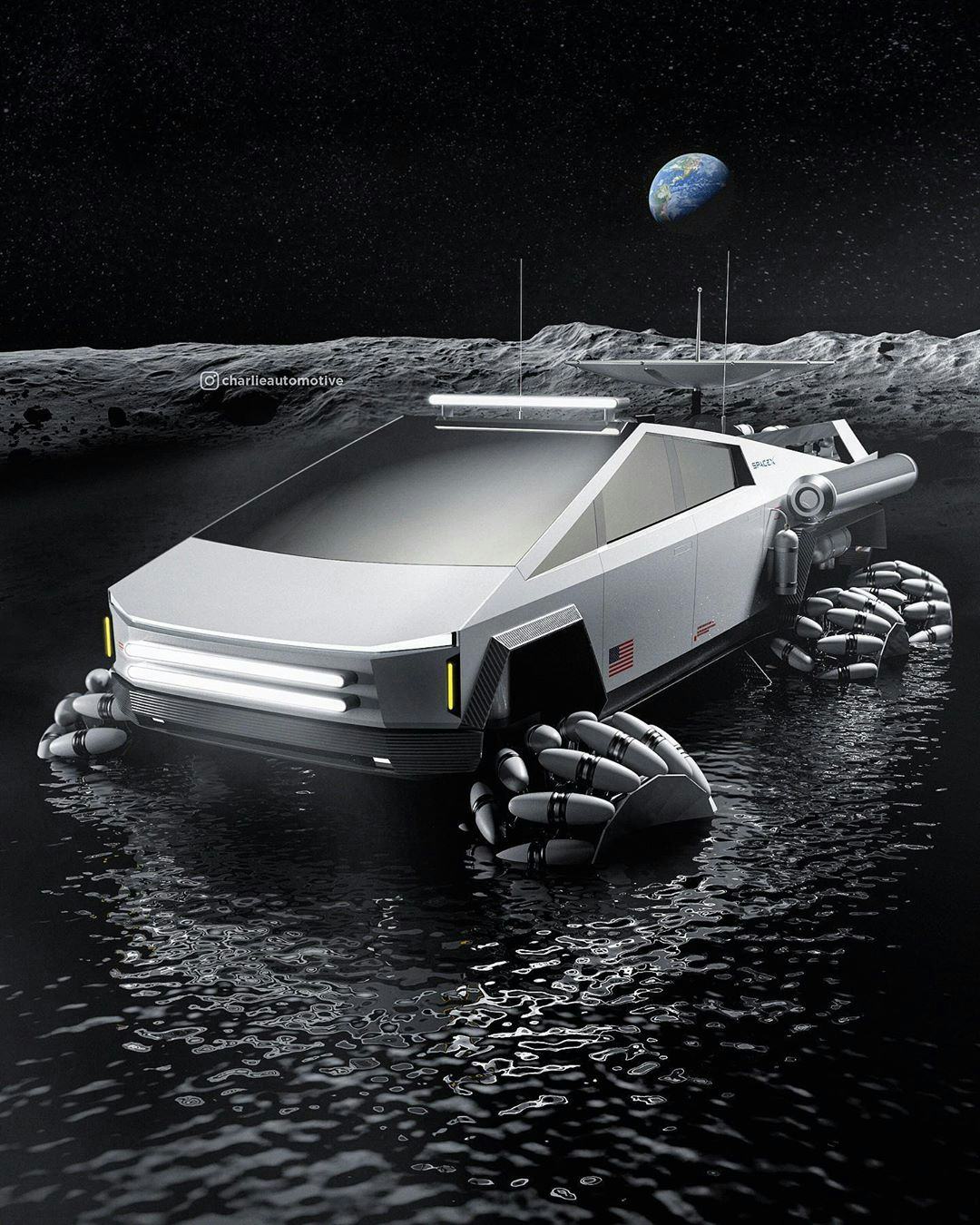 Desde que foi revelada, a Cybertruck, da Tesla, foi imaginada em diversas situações. Agora, o usuário do Instagram, Charlie Automotiv, decidiu juntar as duas empresas de Elon Musk, Tesla e SpaceX, e criar uma versão lunar do veículo.